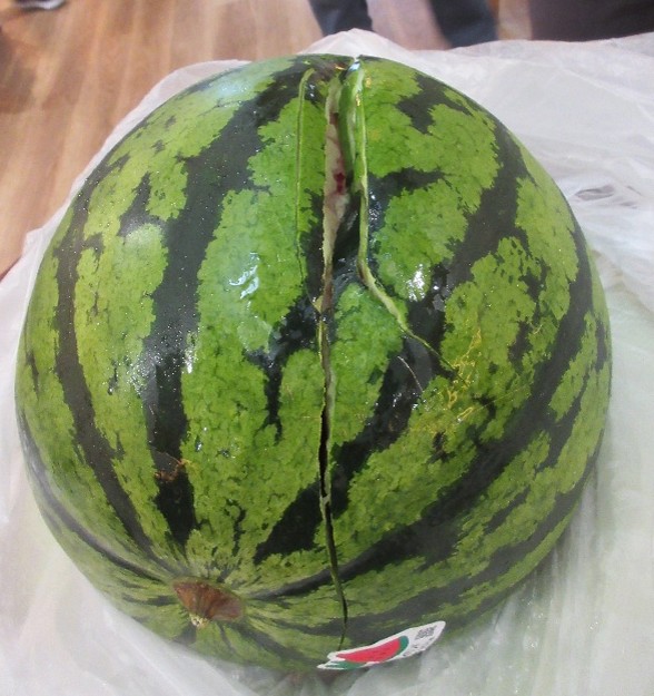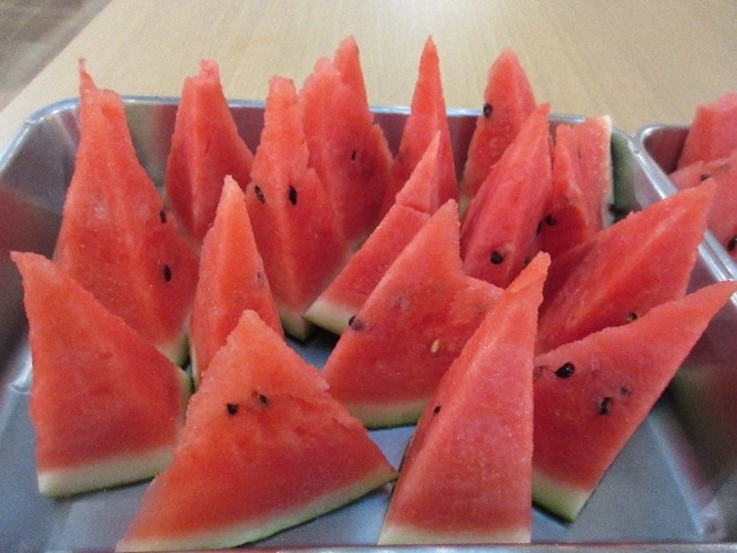 力を合わせて割れたスイカをカットし、おやつに頂きました。
