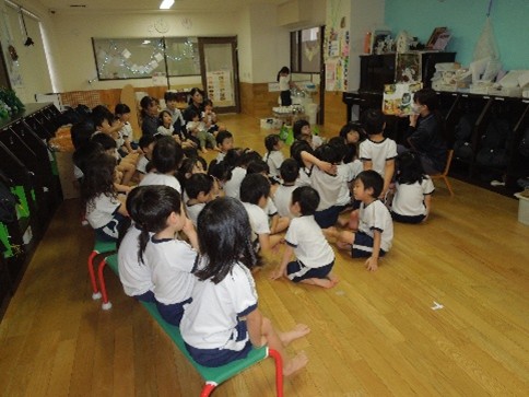 保育者によるクリスマスソングの連弾を聴き、クリスマスにちなんだ絵本
